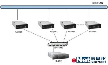 这套全新的SAN模式解决方案是一种几乎拥有无限存储空间的分布式网络,非常适合作为存储系统的核心。它一改过去以服务器为中心的存储模式,以数据存储为中心,采用伸缩的网络拓扑结构,通过具有高传输速度的光通道直接连接方式,提供SAN内部任意节点之间的多路可选择的数据交换,并且将数据存储管理集中在相对独立的局域网内。这一解决方案的最终目标是实现在异构环境中最大限度的数据共享和可管理性。