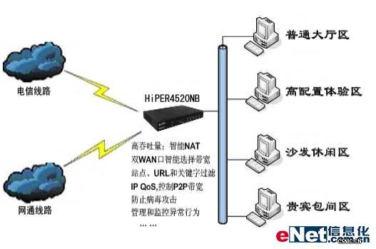 1、双线路接入。网吧选择了目前最为流行的电信网通双线路接入,以降低网络故障系数,其中一条线路出现问题(如中断或被攻击等)仍可使用另一条线路继续游戏,另外通过双线路接入还完美的实现了“访问在网通的网站,数据就走网通的线路;访问在电信的网站,数据就走电信的线路”。通过HiPER 4520NB宽带路由网关为需要多线路接入的用户提供带宽合并的功能实现接入。双WAN口提供具备实时备份功能,能实现多线路带宽合并,可根据源或目的地址指定优先线路,还可依据出口带宽分配流量,使线路利用率达最高,可以实现同时ADSL/光纤等方式的自由组合。)核心交换机采用的是华为千兆的交换机,下边划分为四个网段,分别连在不同的客户区。