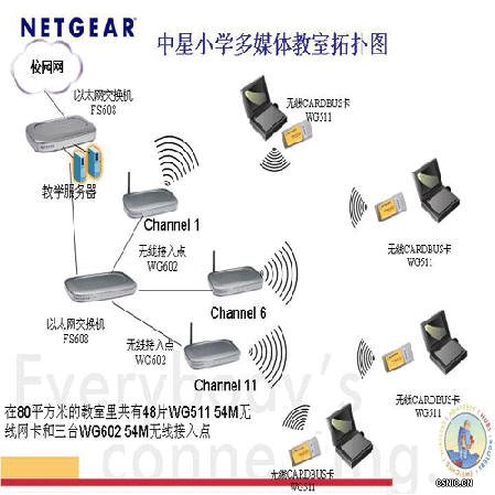 该多媒休教室采用一台NETGEAR公司8端口的10/100M以太网交换机 FS608连接到学校现有的有线以太网,采用NETGEAR公司基于最新无线局域网标准802.11g 54M的无线访问点WG602连接到网络交换机FS608上,从而方便快捷地就建立了一个54M高宽带的无线多媒体教室数据网络,最后是通过校园网的出口连接到INTERNET。