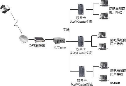 本方案中采用AVCaster 作为采集工作站,采集高质量(720*576)的卫星信号,实现单机采集压缩多路信号,然后由各个网吧内部使用的LiveONE 以拉的方式来取得该卫星信号,网吧内部使用组播方式,最大限度的节省和保证带宽,实现对网吧内部的卫星电视直播。