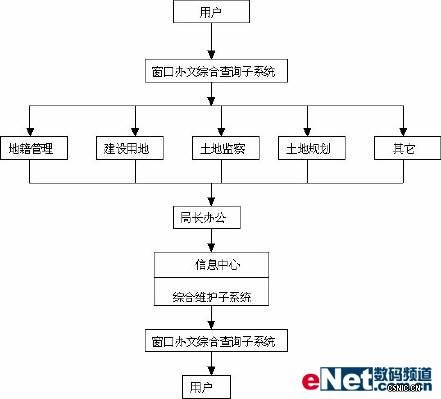 系统采用窗口式办公体系,即所有外部来文都通过窗口收件,然后按不同业务流程通过网络传输到相应的科室,各科室按子系统的流程办完件后,传到信息中心进行图形和表格的输出,最后把办件结果通过窗口发给用户。一般来说,土地管理信息系统由以下子系统构成: a.. 地籍信息管理子系统