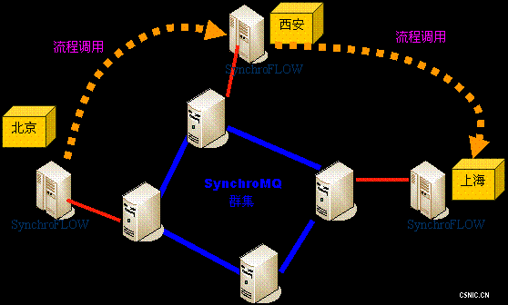 SynchroFLOW的分布式功能以协同时光股份有限公司自主开发的SynchroMQ为消息中间件,可将分布于不同地理位置的SynchroFLOW关联起来,从而实现协同工作,共享数据。它包括: