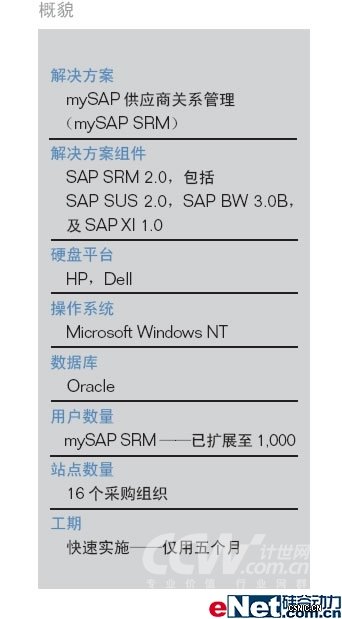 这一目标的核心是为公司与业务伙伴无缝整合构建电子平台。最初,公司采用自主研发的门户。尽管这一系统使公司运营管理向前迈进了一步,但这个门户只是一个信息源,用以显示公司后端SAP R/3 系统环境下相关的离线数据。供应商通过这个门户,可以详细了解订单、供货协议、交货进度、供应品状态及付款状态等信息。但却不能通过这一系统完成确认订单、交货等交易。