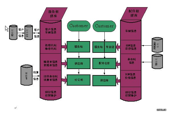 在上面的示意图中,整车客户信息由SD系统提供,信息包括客户名称、电话及其购买的车辆的相关信息。呼叫中心系统(Call Center)和SD系统通过专门的接口对这些客户信息进行读取。配件服务信息系统每天和呼叫中心系统(Call Center)进行一次数据交互,配件服务信息系统从呼叫中心系统获取新的客户信息,并将此信息提供给服务站,由服务站来完成相应车辆的保养服务和报修服务;呼叫中心系统每天从配件服务信息系统中获取维修相关信息,来对服务过的客户进行回访,验证服务的真实性,实现客户关怀。配件服务信息系统又和福田整车明细表数据做接口,及时获取车辆组成的零部件更改明细,并在配件服务系统中完成整个车辆从总成到各散件的明细维护,并将这些零部件信息通过配件服务信息系统提供给各服务站,指导服务站向福田公司采购配件和对车辆进行维修,并在系统完成信息提报。配件服务信息系统最后将相关财务信息通过相应接口输入到用友U8财务系统中,生成相关凭证。
