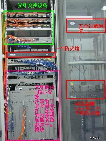 如图大家看到的是标准的机柜里面放了一堆家伙。请注意一个小小的细节:这个柜子里面的网线和光纤插头应该有2百多个,不过大家想想,如果不采用标准的布线方式的话,这里肯定都是蜘蛛网子了,对一个网络管理员来说,将是巨头疼的事啊!