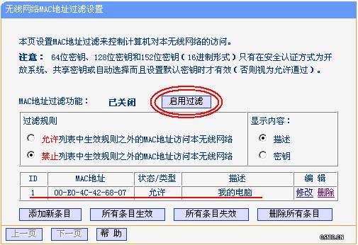 如上图所示,输入了允许的MAC地址以后,最后别忘记点击“启用过滤”的按钮!