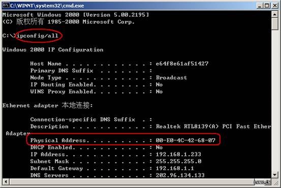打开DOS界面后,使用键盘输入命令“ ipconfig/all ”回车就可以看到类似上面图片中的信息,其中红色方框勾勒的“ Physical Address ”就是网卡的物理地址也就是MAC地址。