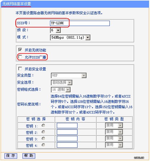 在TL-WR541G上的配置界面如下图所示,红色标示内WR541G默认确定的SSID是TP-LINK,将默认的广播SSID的选项去掉,这样WR541G就不会再向周围环境通告自己的存在,或者说一定程度上只有自己知道WR541G的存在。