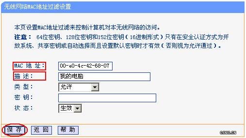 输入自己网卡的MAC地址,并进行适当描述,其他参数默认(类型选择允许,密钥不填,状态选择生效),然后点击保存按钮,如下图所示:
