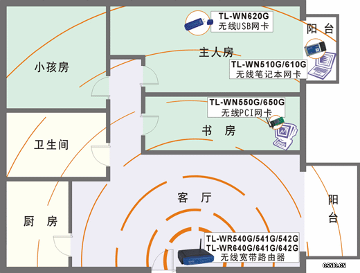 如图所示,将TP-LINK域展™&速展™无线宽带路由器TL-WR640G/641G/642G放置在客厅,即可以覆盖整个家庭,您可以在书房的台式机通过TP-LINK无线PCI网卡TL-WN650G实现无线上网,也可能在卧室、阳台及其他地方通过TP-LINK无线笔记本网卡TL-WN610G或无线USB网卡TL-WN620G使用笔记本实现无线上网。