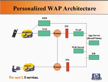 惠普公司的WAP解决方案采用BroadVision作为后端的个性化服务平台,以实现个性化的应用在BroadVision与WAP体系结构之间,采用自行开发的集成环境使之无缝连接。在BroadVision平台上可实现个性化的内容整合、业务模式等功能与服务,手机通过WAP来访问这些个性化的应用服务。体系结构如下图所示。