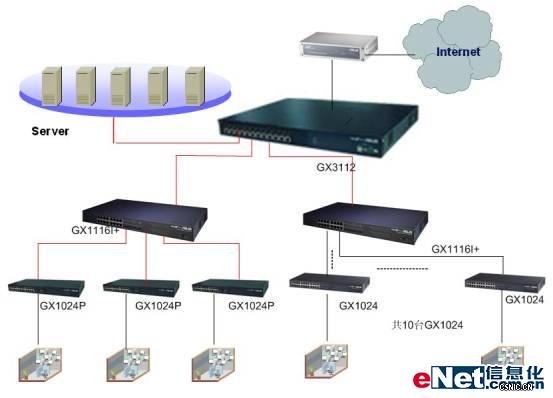 宿舍楼通过GX1024实现100M用户接入,汇聚至GX1116I+,通过千兆光纤连接至核心机房。而办公楼及综合楼用户则通过GX1024P百兆接入,利用GX1024P的1000M铜缆端口与GX1116I+千兆相联,GX1024P的VLAN、广播风暴控制可以减少广播,有效提高带宽,满足用户群组划分功能需求。最后,二台汇聚交换机GX1116I+上联至GX3112,构成层次明晰的整个新校区网络体系。不仅配置管理简单方便,而且运行安全稳定。