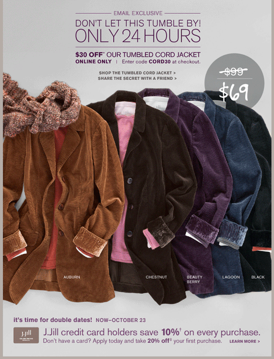 Method,J..Jill非常善于产品布局、文本样式及空间的综合协调布局,以在邮件中创造轻快或成稳的感觉。在以下电子邮件中,它们分别使用 GIF动画着重突出其折扣促销、价格优惠。这种微妙的处理,体现了审美和促销推广的巧妙融合。