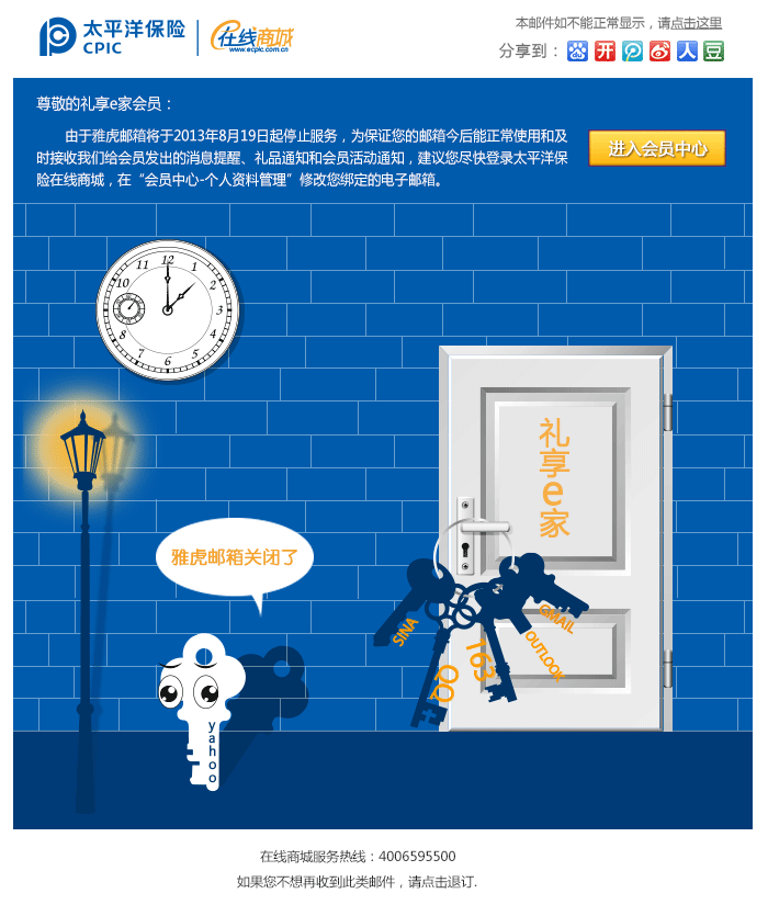 当洛杉矶的设计师Paul Marra搬迁陈列室到一个新的位置,他使用GIF动画去讲述整个故事,从地图上的线路轨迹到“We moved!”横幅,再到新的地址列表。整个邮件显得轻快,时尚,温馨。太平洋保险的例子,也是告诉我们,有时候一个枯燥的公式化的通告,也能变得有趣!
