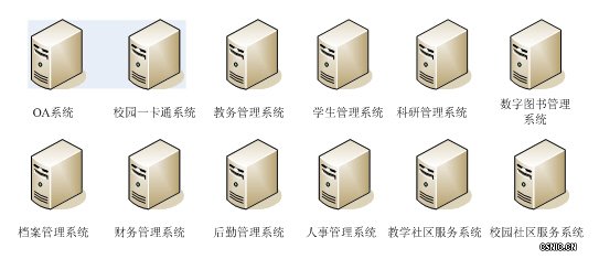 应用系统是学校办公自动化和数据共享的信息平台。学院的应用系统包括OA系统、校园一卡通系统、数字图书管理系统和档案管理系统等12个系统。具体如下图所示: