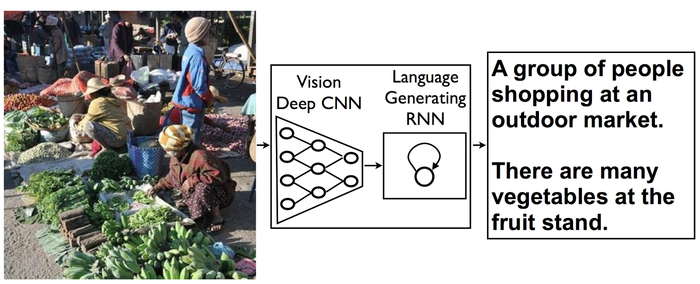 在以前,业界在用计算机对图片进行自然语言描述时基本使用的都是计算机视觉和自然语言处理技术;但现在得益于机器翻译技术的进步,通过递归神经网络(RNN)转换,机器可以先把法语转换成一个矢量,接着另外一个RNN用户就可以通过这个矢量把法语转换成德语;这样Google只要能用另外一种具备图片识别能力的神经网络(卷积神经网络,CNN)替换掉第一个RNN就可以得到一句能描述图片的自然语言了。