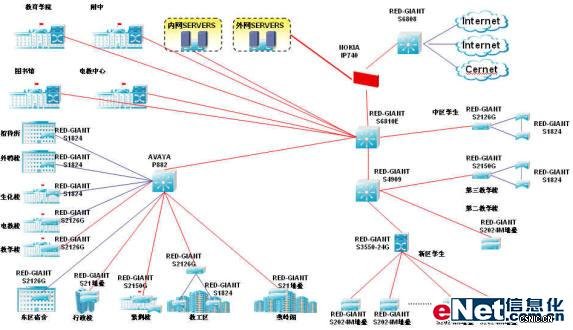 ZXR10 GER设备作为出口路由器,两台ZXR10 T64G负载均衡作为核心汇聚层设备,汇聚层采用六台ZXR10 T40G,楼宇汇聚及楼道交换机主要采用了几百台39及28系列产品。