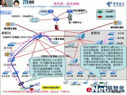 作为校园网的主导用户,学生以其灵活性、好动性以及自我挑战性注定了校园网将是一个必须安全接受各种考验的网络,中兴通讯紧密结合学生自身特点和建网经验,制定并实施了一套非常有效的防止代理防止私接的策略:
