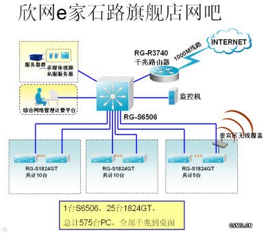 针对欣网E家,锐捷对网吧内部的网络环境进行了详细的规划,整个网络采用二层拓扑结构,分为核心层、接入层。核心层使用1台RG-S6506万兆骨干交换机,领先的SPOH硬件设计和万兆核心技术提供了稳定,高性能,高可靠的网络核心,实现了网络数据的高速转发,保证了网吧核心业务的正常运营;接入层由多台全千兆接入交换机RG-S1824GT组成,提供千兆带宽接入到桌面,保证了网友桌面应用的流畅高速;一台全千兆路由器RG-S3740负责出口所有的安全问题和出口的NAT转换及基于IP的出口控制,当后期增加新的百兆出口的时候可以直接和目前的千兆接口进行捆绑,以达到负载均衡和相互备份,打造了一个高速,安全,稳定的网络出口。