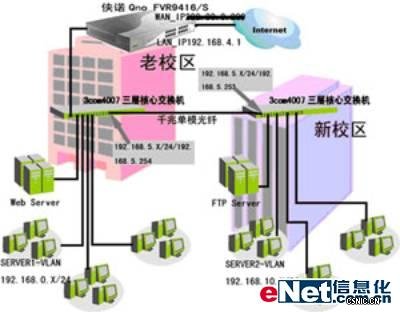 校园网络申请电信一个固定IP,通过侠诺的路由器产品 WAN口实现单线连接Internet,内网路由器LAN口下连接多个三层千兆核心交换机构造主干网络,实现多个VLAN的划分以满足多客户端的接入要求,新老校区通过千兆单模光纤连接核心交换,实现新老校区的网络连接。同时通过路由器的端口映射功能实现内网Web服务器和FTP服务器的对外连接。具体网络组网结构如下图所示。