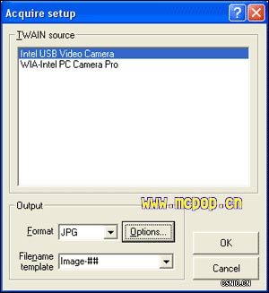 在Windows XP系统中安装并启动ACDSee程序,セ鞴ぞ呃干系摹癆cquire”按钮,在弹出的设置窗口的“TWAIN source”列表中选择设备(如图1),这里我们选择“Intel USB Video Camera”设备(笔者用的摄像头是Intel的CS430)。