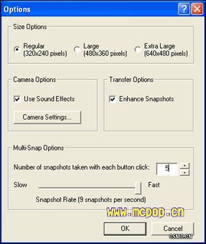 如果对拍摄的画面效果大小不满意,或者颜色有偏差,我们可以通过左下角的“Options”按钮打开调节窗口进一步设置(如图3)。在“Size Options”中可调节画面尺寸大小,“Multi-Snap Options”选项中可设置每次按下快门时所拍摄得静态画面数,其下的滑块可用来调节快门的速度。
