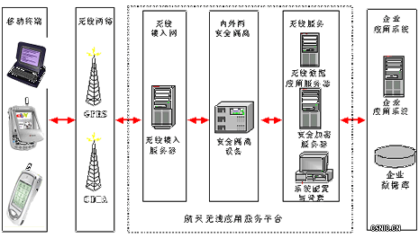 提供通用的解决方案,实现无线应用中关键需求,包括:GPRS/CDMA无线网络连接,内外网安全隔离、远程终端身份认证和数据加解密、与企业数据库系统的无缝连接等;