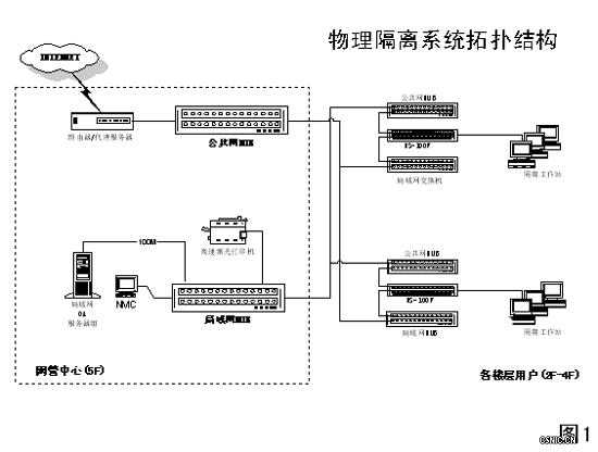 2-4楼每个楼层现已采用10M/100M集线器作星形连接,与各用户工作站相连接;每个楼层的集线器均与安装于机房的主集线器(5楼)相连。由于改造之后的网络结构将使涉密网和公共网这之间无任何物理连接,故每楼层和机房需添置用于连接公共网络的集线器。