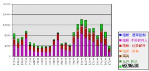 从每小时的垃圾邮件流量监控图来看,梭子鱼有效地阻挡了70%的邮件,皆为垃圾邮件或病毒邮件。