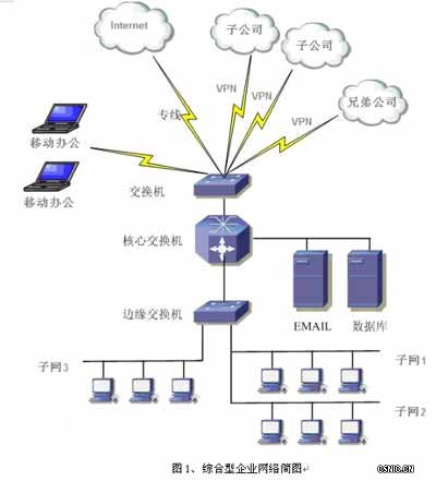 中小企业网络一般只在总部设立完善的网络布局。采取专线接入、ADSL接入或多条线路接入等网络接入方式,一般网络中的终端总数在几十到几百台不等。网络中有的划分了子网,并部署了与核心业务相关的服务器,如数据库、邮件服务器、文档资料库、甚至ERP服务器等。