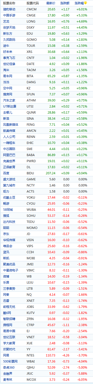 中国概念股周四收盘涨跌互现,2支股票涨幅超过5%,猎豹移动涨6.01%报20.65美元,中国手游涨5.33%报17.8美元;2支股票跌幅超过5%,金融界跌5.88%报5.92美元,麦考林跌6.05%报3.73美元。