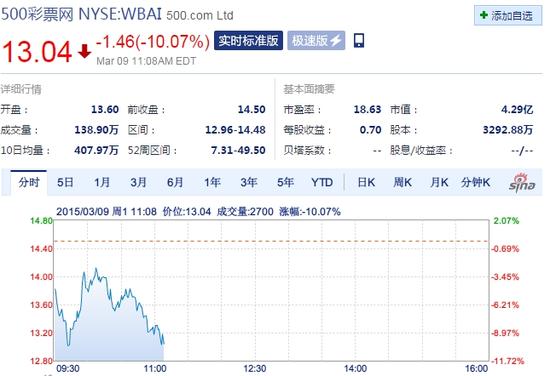 新浪科技讯 北京时间3月9日晚间消息,中国概念股500彩票网盘中大跌约10%。截至北京时间23:08,500彩票网跌1.46美元,报13.04美元,跌幅为10.07%。