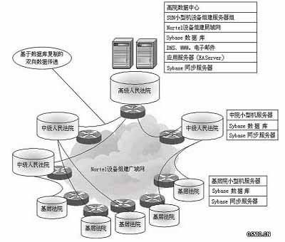 在高院数据中心,采用SUN小型机设备组建服务器组,使用Sybase数据库和Sybase的同步服务器,并配备应用服务器(EA Server),采用Nortel设备组建局域网; 在中院与基层法院均设立一个中心数据库服务器 Sybase数据库,并且配置Sybase的同步服务器,采用Nortel设备组建法院系统的广域网,实现数据库复制的双向数据传递,通过Sybase的同步技术实现了分布式数据库管理,使得三级法院间的案件信息能够在工作时间实现实时更新。而且每个法院,各部门之间信息在权限确定的范围内实现实时沟通,提高办公效率。整个系统实现了基层法院管理本院的案件信息,中级人民法院管理本院及下辖法院的案件信息,高级人民法院管理全市法院的案件信息,实现了上级法院对案件的跟踪监控,提高了促进司法公正的力度。