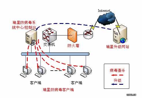 升级是考察一个杀毒软件优劣的重要指标,瑞星公司承诺每个工作日升级3次。针对中联部网络结构特点,外网可直接接入互联网,由外网系统中心自动通过瑞星升级网站进行在线升级,然后再由外网系统中心通知所属外网客户端进行自动升级,完全不需要用户参与。