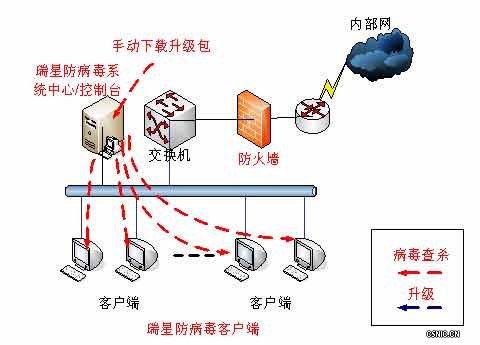 内网与外网、互联网进行了物理隔离,所以不能进行这种在线自动升级模式,只能通过外网机器定期到瑞星网站手动下载升级包,然后把升级包复制到内网系统中心服务器上进行手工升级,当内网系统中心升级完成后,所属内网客户端会自动从内网系统中心进行升级。