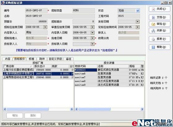 请购批准后,采购施工部根据请购单的物资需求,进行选择该项目上的合格供货商来开始招投标工作,招投标的审批过程中,需要有技术审批和综合评审, 通过PowerOn中的送件记录可以来进行技术及综合评审的需求,将评审的结果与招标信息一起决定中标的单位。