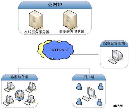 该系统是一个独立的软件系统,分为服务器端、控制台管理端、客服人员端、客户端四部份。