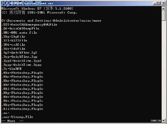 尽管这种方法可以提供各种信息,同时你也可以通过它来更改文件关联,但它缺少一些基本功能,比如说提供一份可以打印出来的文件关联清单。对于Windows 2000和Windows XP的用户来说,系统为他们提供了一条命令可以完成这样的工作:在命令提示符下输入ASSOC。如果该命令在输入时未加其它参数,屏幕将不间断地迅速给出文件关联表——从.$$$(AUTOCAD备份文件)到.zip(zip压缩文件)。如果你希望在每显示完一页之后系统提供一个间断,你需要在命令后面添加“ more”(即键入assoc more)。在标准美式键盘上,符号“ ”在符号“\”上方。你可以通过下面的命令查阅删除或修改关联方式的方法:assoc /?,但这里我并不推荐用它里面提供的一些修改方法。这个命令更为有用的地方在于它可以提供一个完整的关联列表。键入:“assoc>list.txt”,所有的文件关联方式将输出到当前目录的list.txt文件中。(如图4)