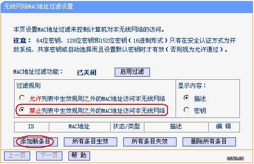 注意:选中“禁止列表中生效规则之外的MAC地址访问本无线网络” 、单击“添加新条目”按钮继续配置,如下图所示