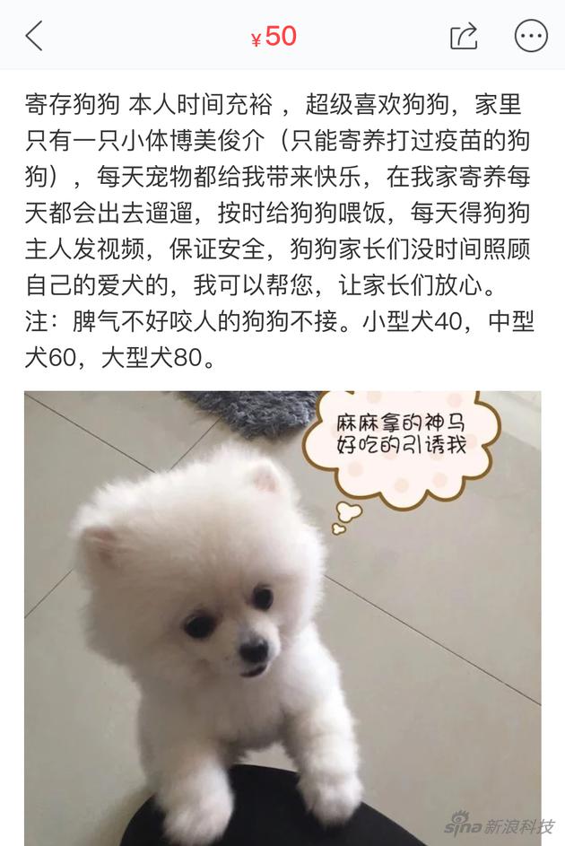 无奈之下,翻阅闲鱼App,在附近鱼塘中搜“宠物寄养”等关键字,发现一名卖家提供该服务,平时价格为40元每天,春节期间涨价20元。询问后在闲鱼App中拍下。随后将宠物带到对方家中,告知狗狗的饮食习惯,对方接收。